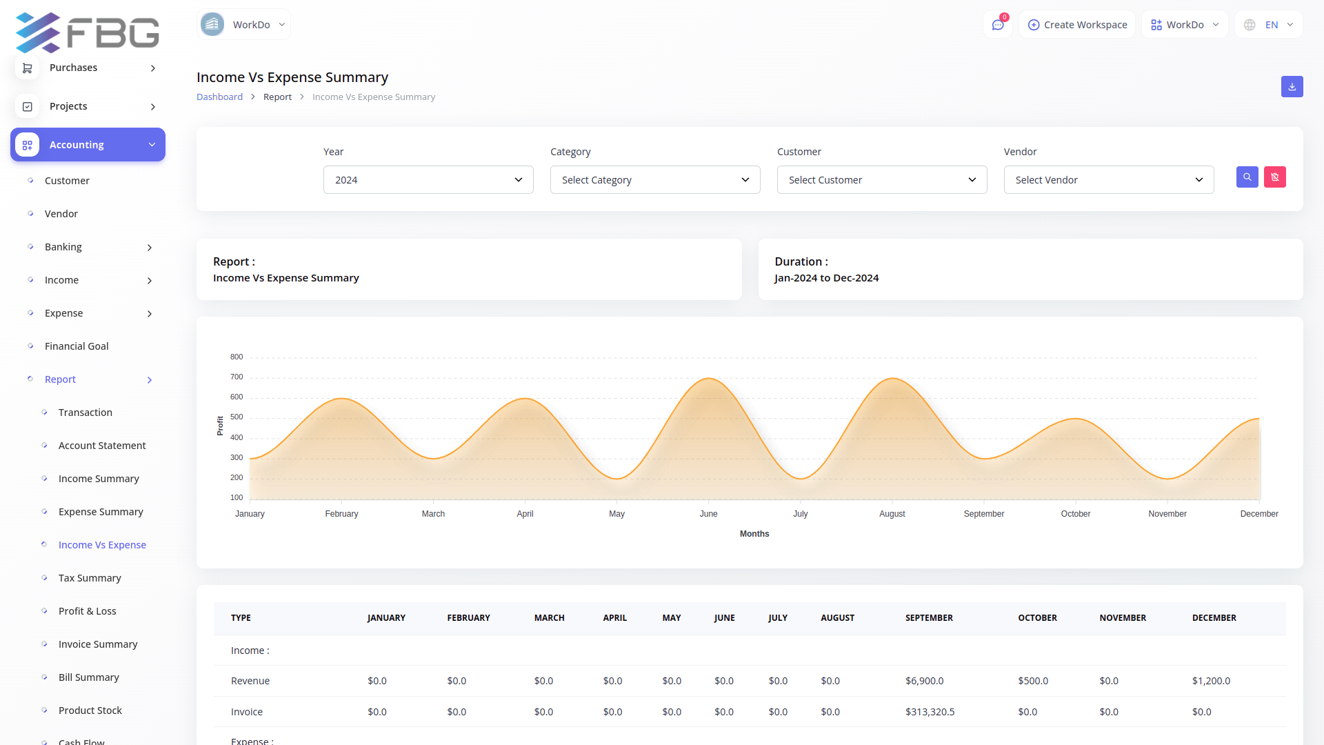 A budget is a financial plan for a specified period to keep in check with the working capital. This feature here helps to maintain the capital flow. You can set monthly, quarterly, half-yearly, or yearly budgets according to your business plans and needs. The main categories are “Income” and “Expense” where one can edit /update /delete the sub-categories as well.