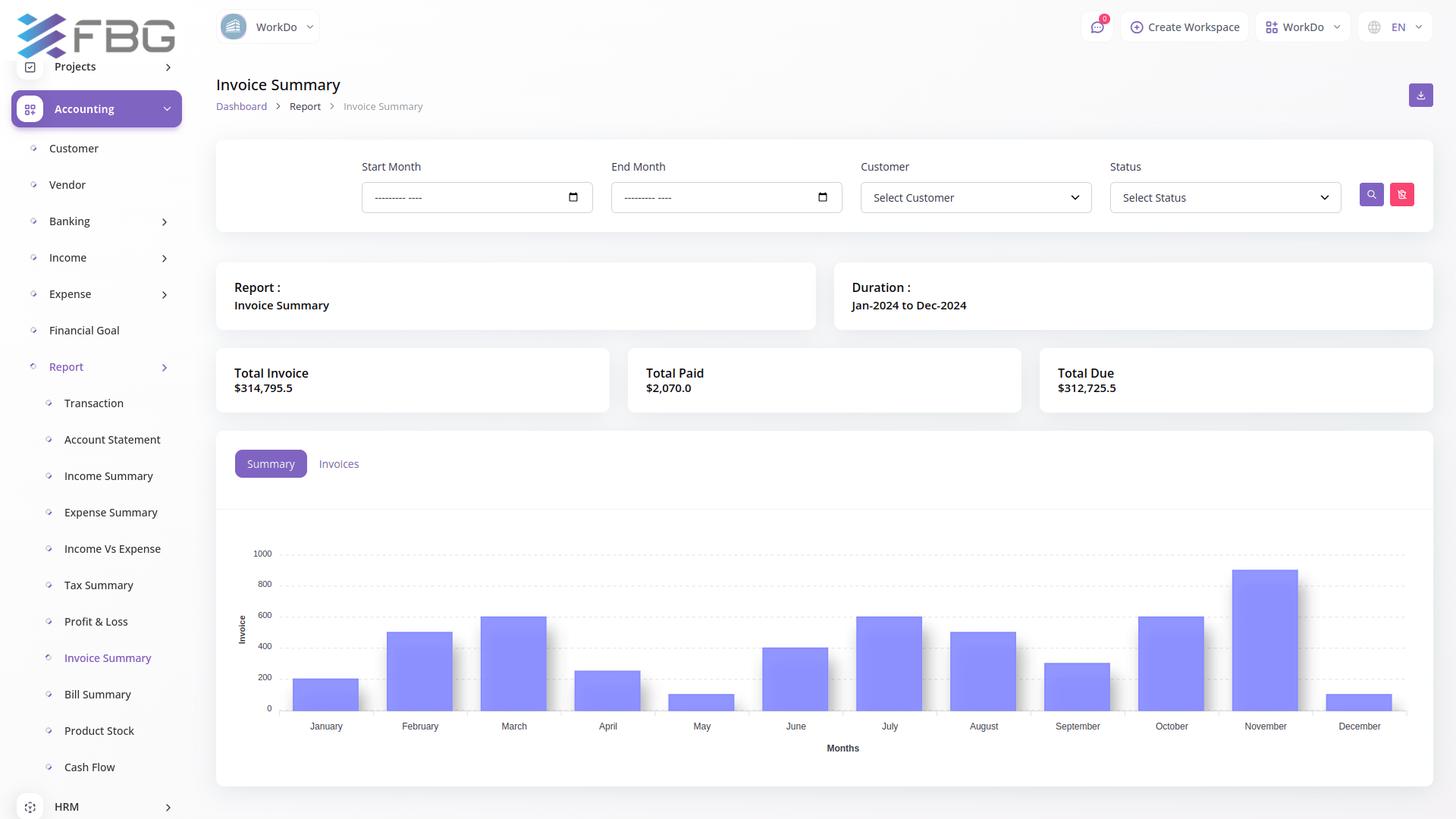 Get a report on transactions with an easy filtering option. Download the required account statements in either PDF, CSV, or Excel format. You get duly prepared reports on individual Income, Expenses, Tax, Invoice, and bill summary. Filter them based on Account, category, and customers. Also, a graphical display of the Income VS Expense chart along with a detailed calculation of Profit and Loss will help you make informed decisions. Filter the tax summary and Income VS Expense chart based on financial years.